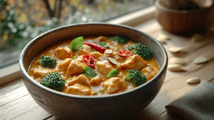 Dieses Putencurry ist eine großartige Wahl für alle, die gesund abnehmen möchten, ohne auf Genuss zu verzichten. Die Kombination aus eiweißreicher Putenbrust, ballaststoffreichem Brokkoli und scharfer Chili sorgt für eine langanhaltende Sättigung und regt den Stoffwechsel an. Mandelblättchen und Minze geben dem Gericht eine besondere Note, während die cremige Kokosmilch für ein rundes Geschmackserlebnis sorgt.