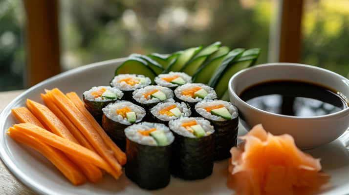 💡 Tipp: Serviere dein veganes Sushi mit einer leichten Sojasoße oder Tamari und verzichte auf kalorienreiche Dips wie fette Mayonnaise.
